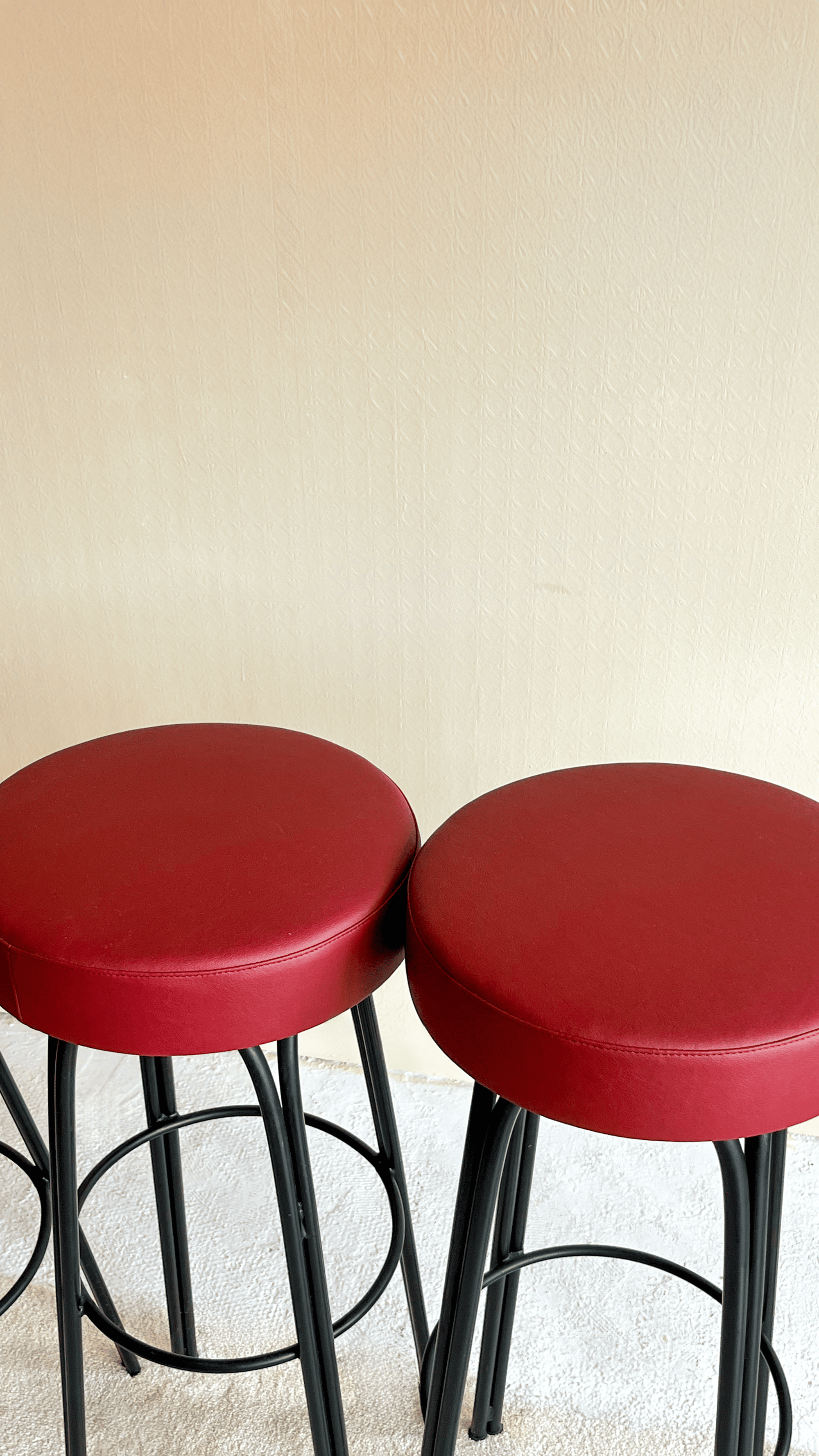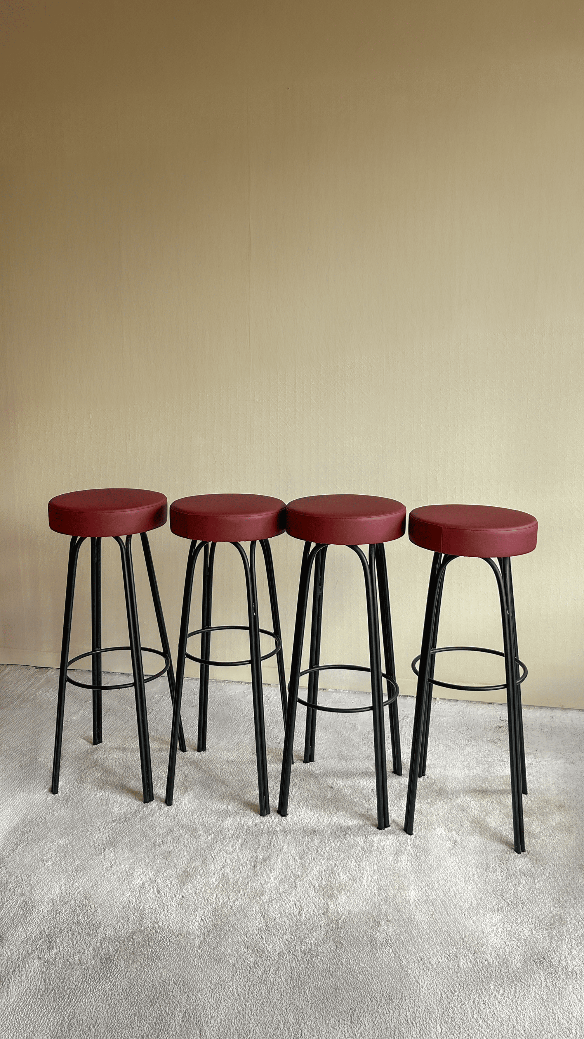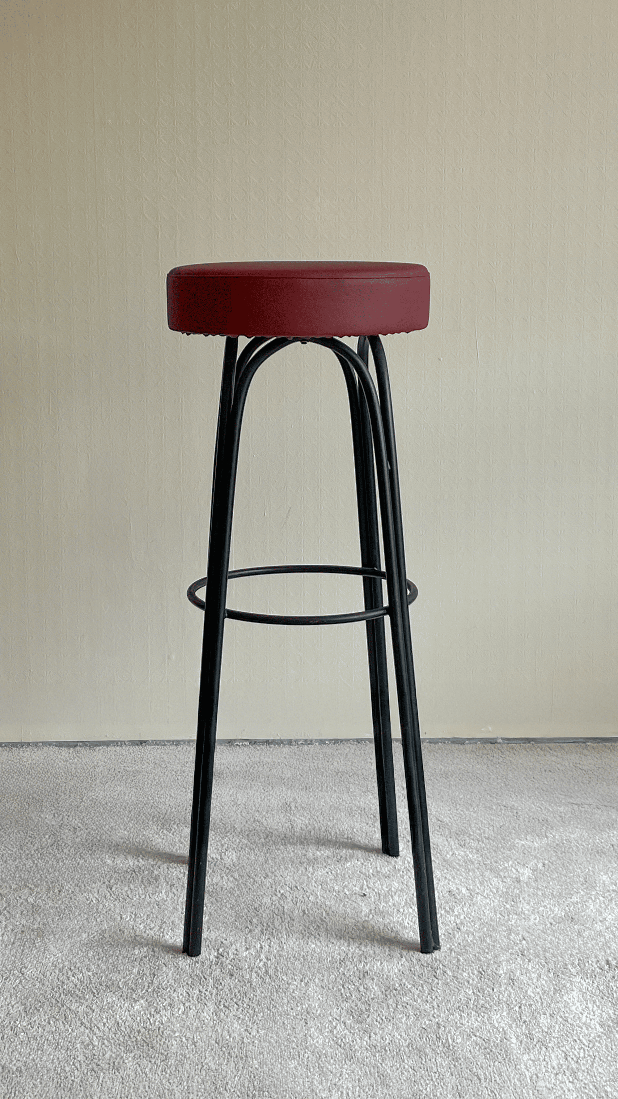 Son assise circulaire de 35 cm de diamètre est désormais revêtue d’un simili cuir bordeaux profond, à la fois sobre et audacieux, apportant une touche chaleureuse à n’importe quel espace – que ce soit autour d’un bar, dans une cuisine ou un atelier créatif. Le coussin d’assise de 7,5 cm d’épaisseur offre un confort ferme mais accueillant, idéal pour de longues discussions ou sessions de travail.